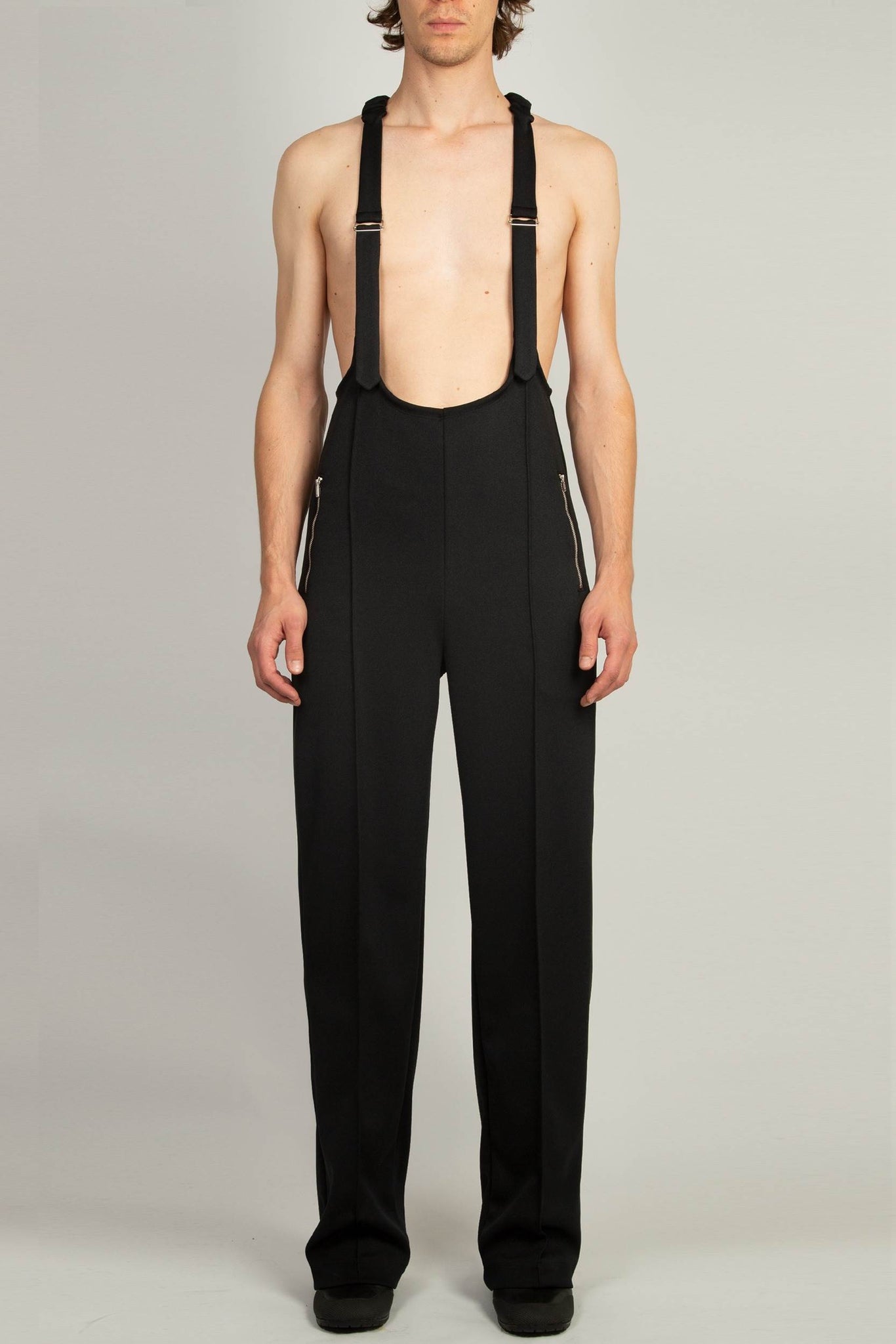 A refined jersey salopette designed for ease and polish. It features pin tuck detailing that sharpens the line, functional zip pockets, and adjustable covered elasticated braces for a secure, customizable fit. Presented in Black and cut in a smooth jersey handle.