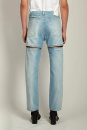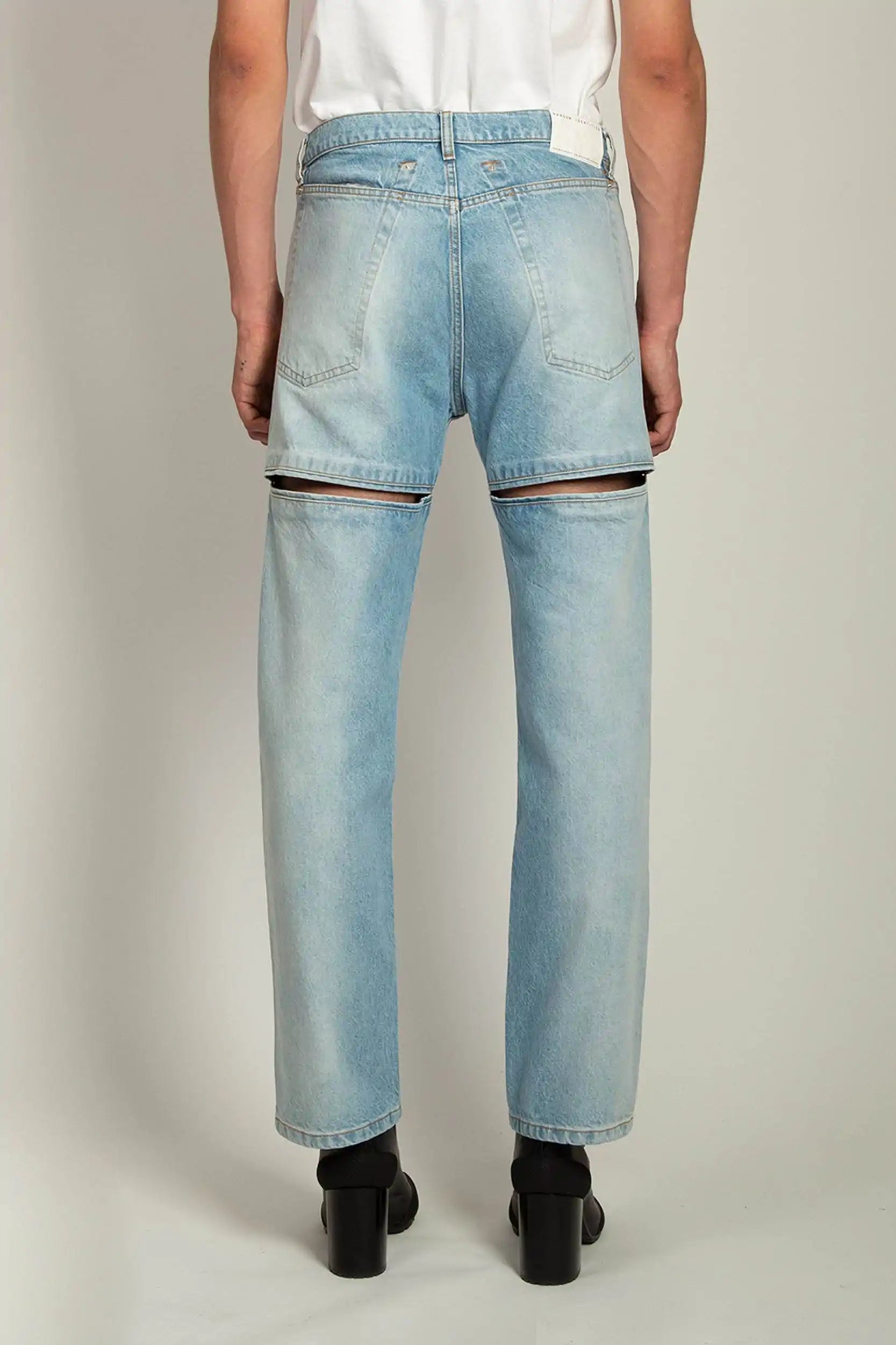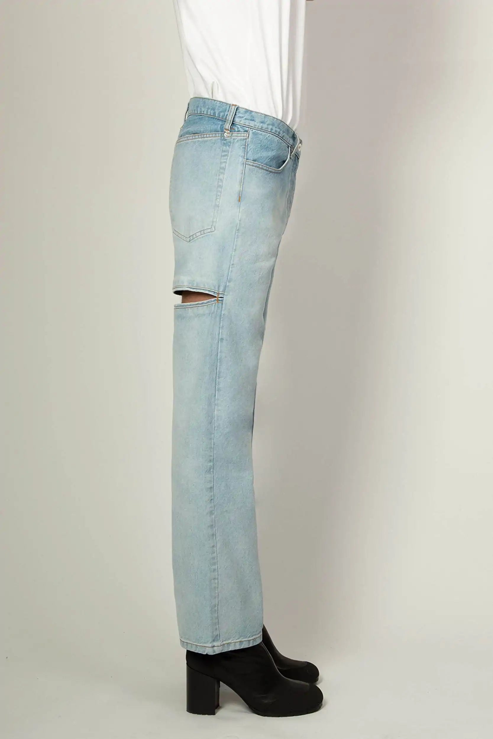 Straight‑leg classic jeans with contrast top‑stitching and slash openings at the back mid‑thigh.