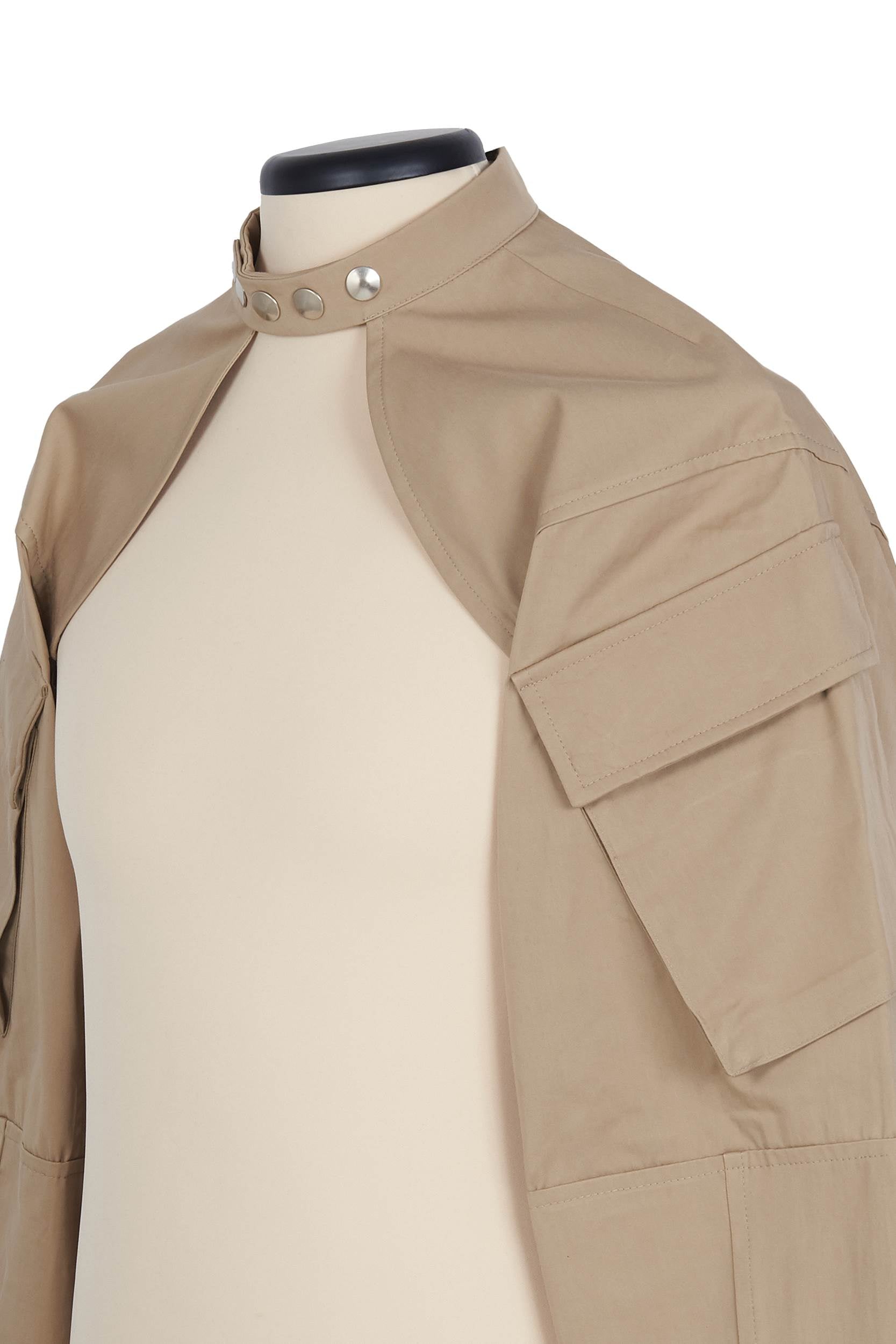 A collarless shrug jacket featuring press-button fastening and a cargo pocket at the sleeve. Crafted in 100% cotton and presented in the beige colorway. Finished in a Regular Fit for everyday wear.