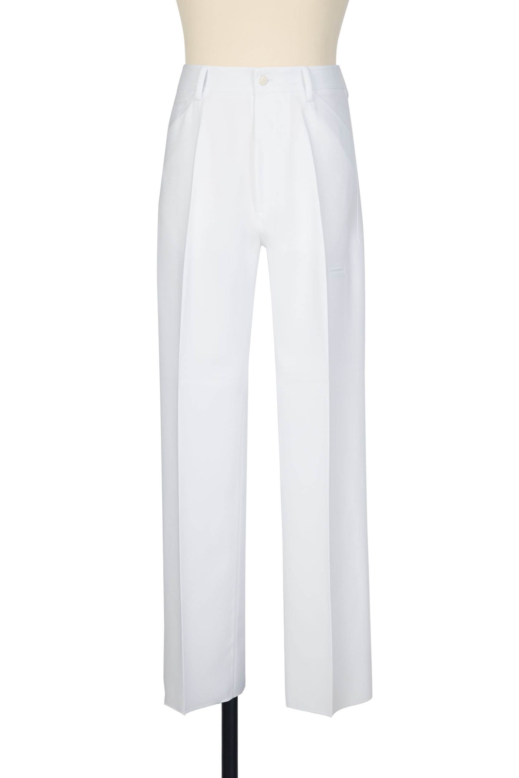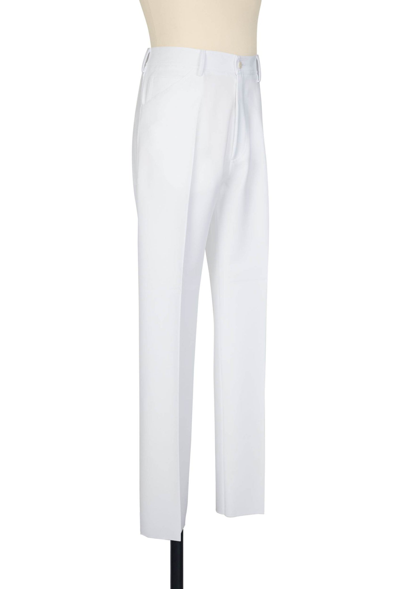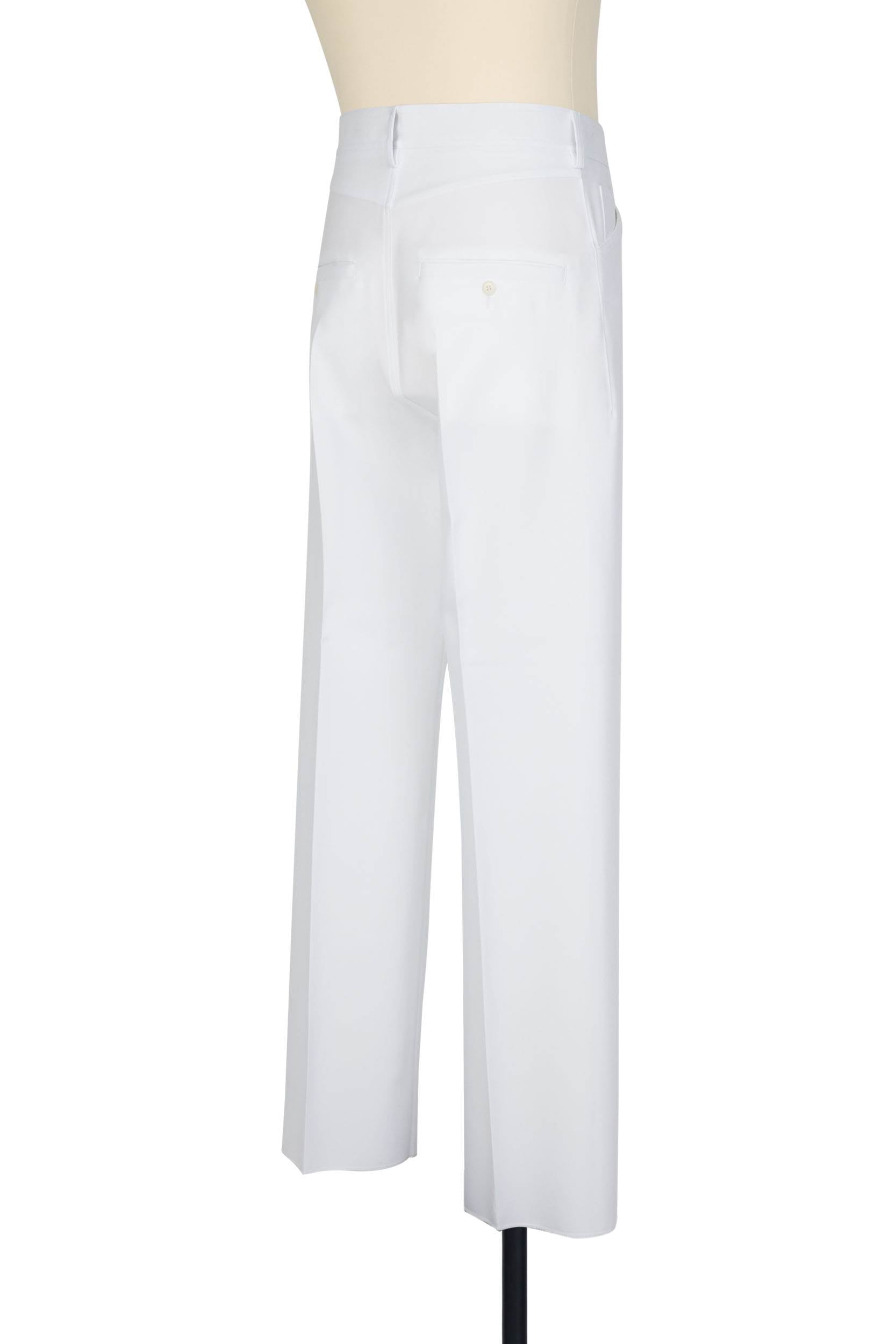 High-rise, straight-leg five-pocket trousers in white gabardine with no side seam, tip pocket at thigh, single jet back pockets, and yoke insert.