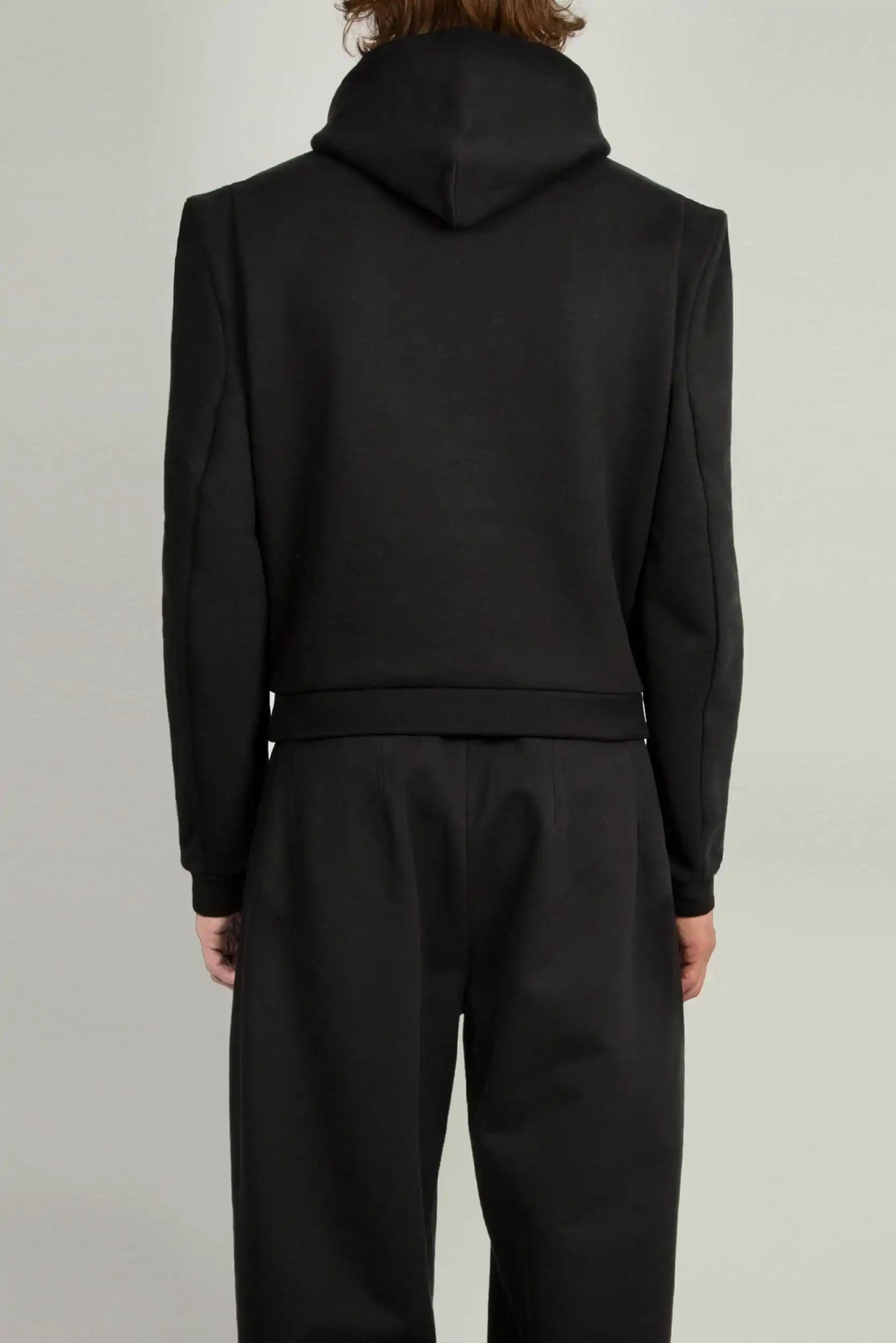 Felpa con cappuccio caratterizzata da spalle strutturate, manica a due pezzi e fondo manica con pinces; finiture minimali nello stesso tessuto.