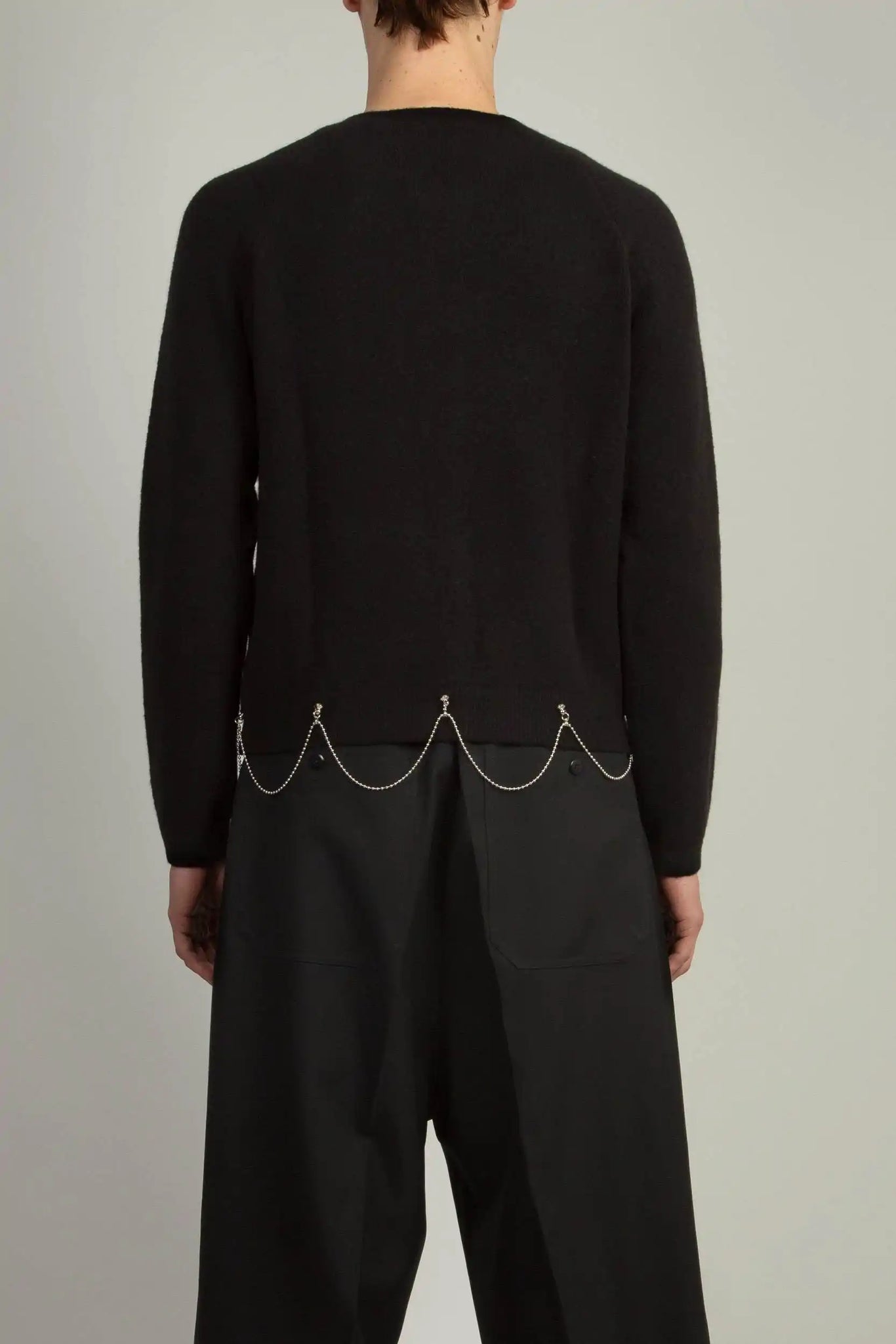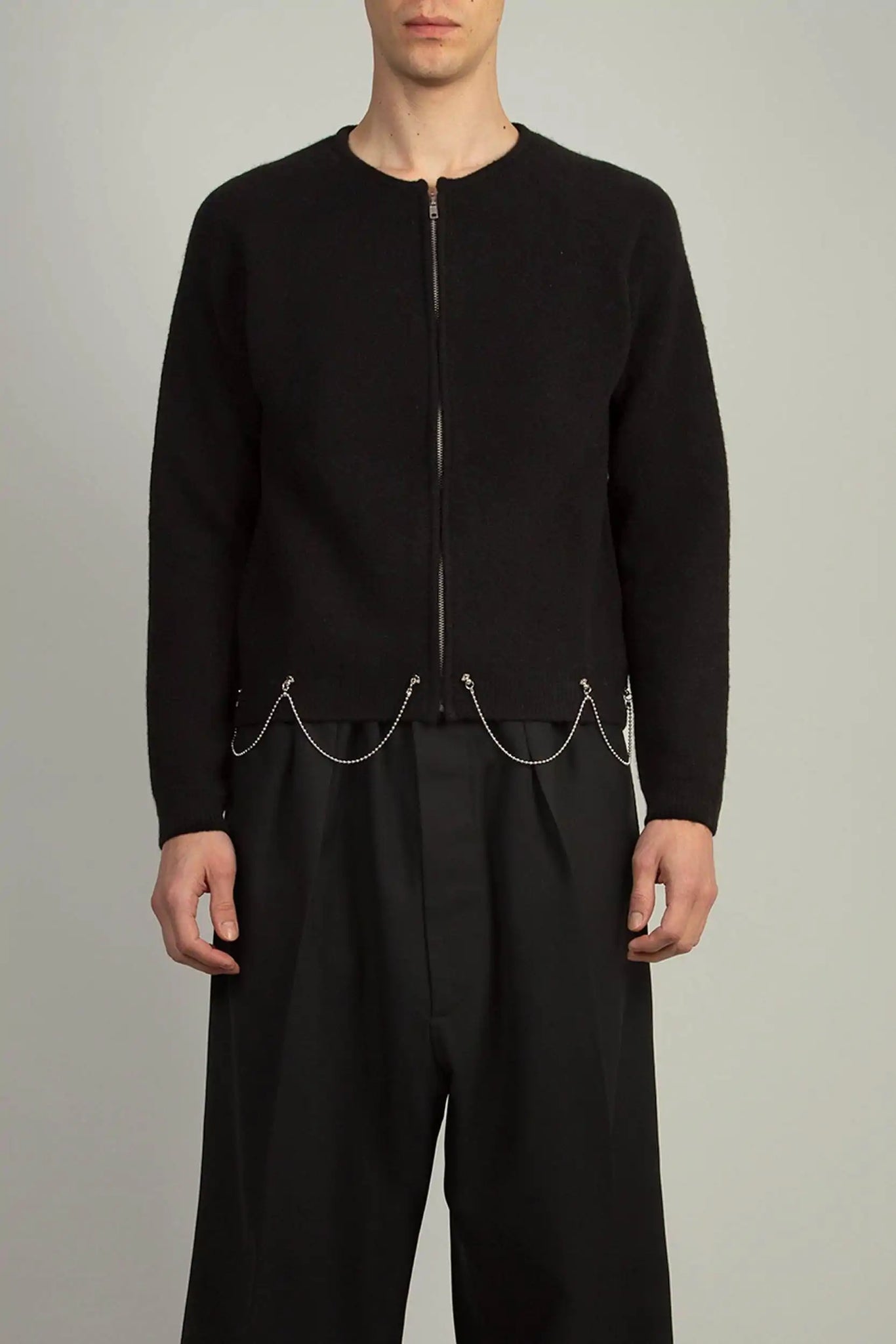 Cardigan elasticizzato Shetland con zip integrale in nero, vestibilità maschile, maniche a sella, bordi a costine 1x1 e dettaglio a catena sull'orlo per un finish minimal e moderno.