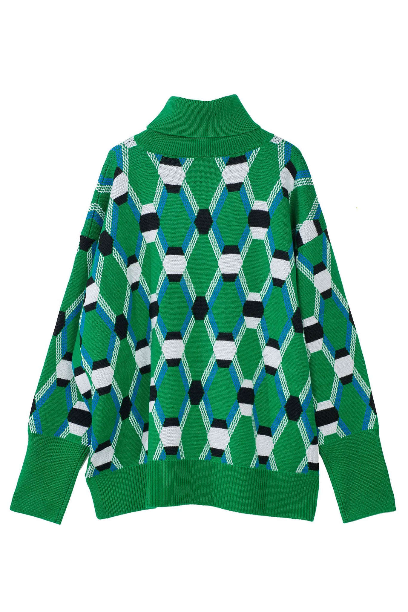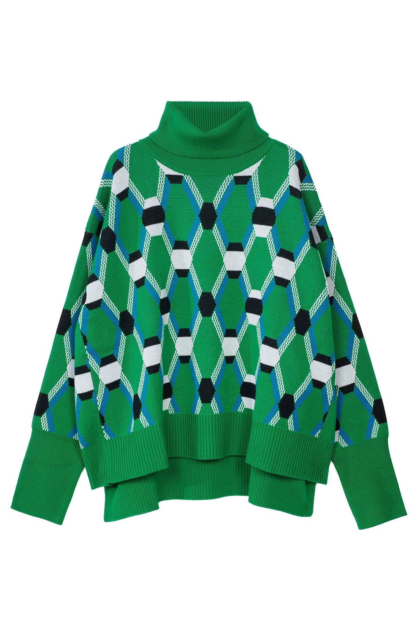 Maglione oversize a collo alto, spessore medio, con nuovo jacquard a rombi a 4 colori e bordi a coste 1x1.