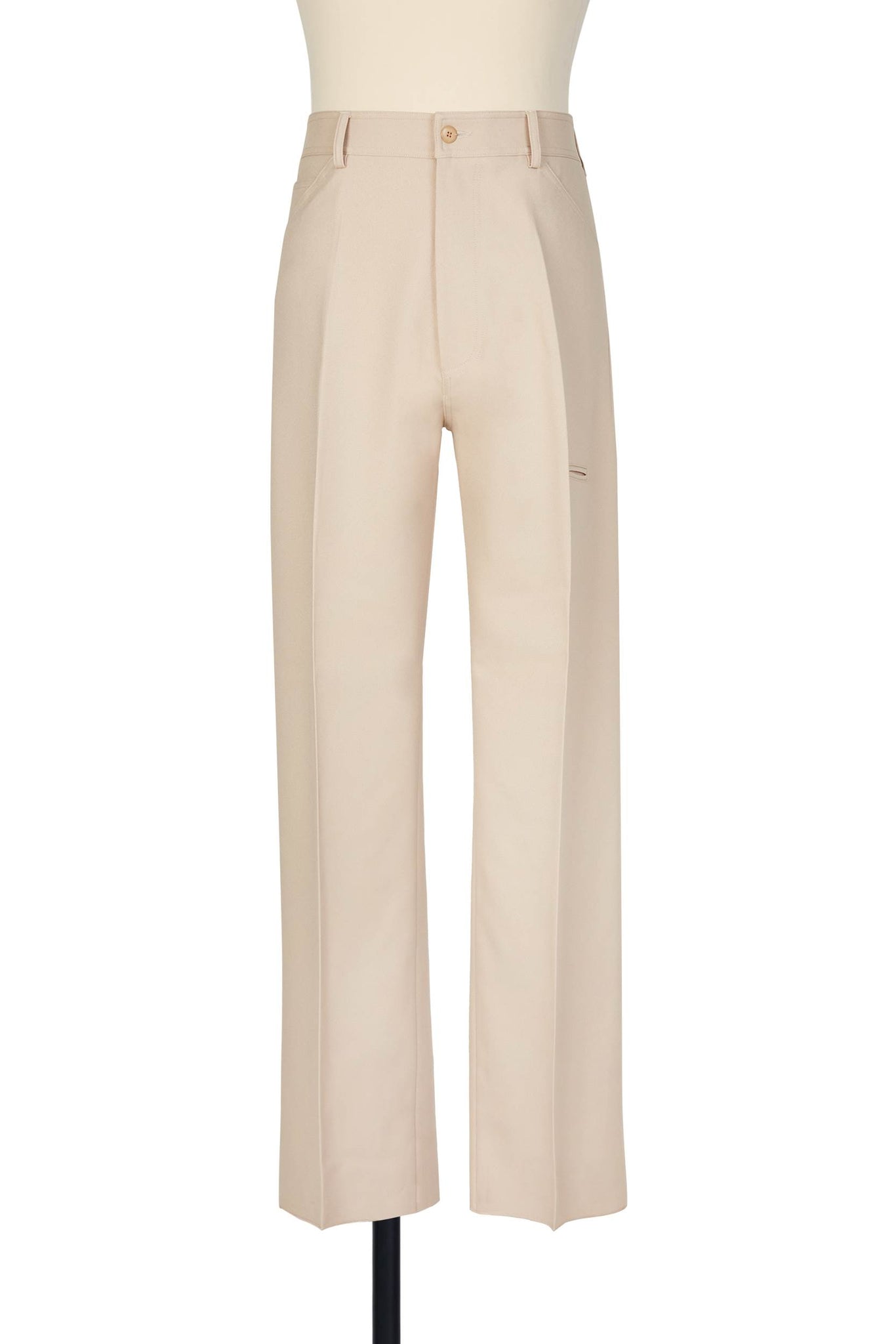 Pantaloni a cinque tasche a vita alta e gamba dritta in gabardine beige, senza cuciture laterali, tasca a punta sulla coscia, tasche posteriori a filetto e inserto sul carré.