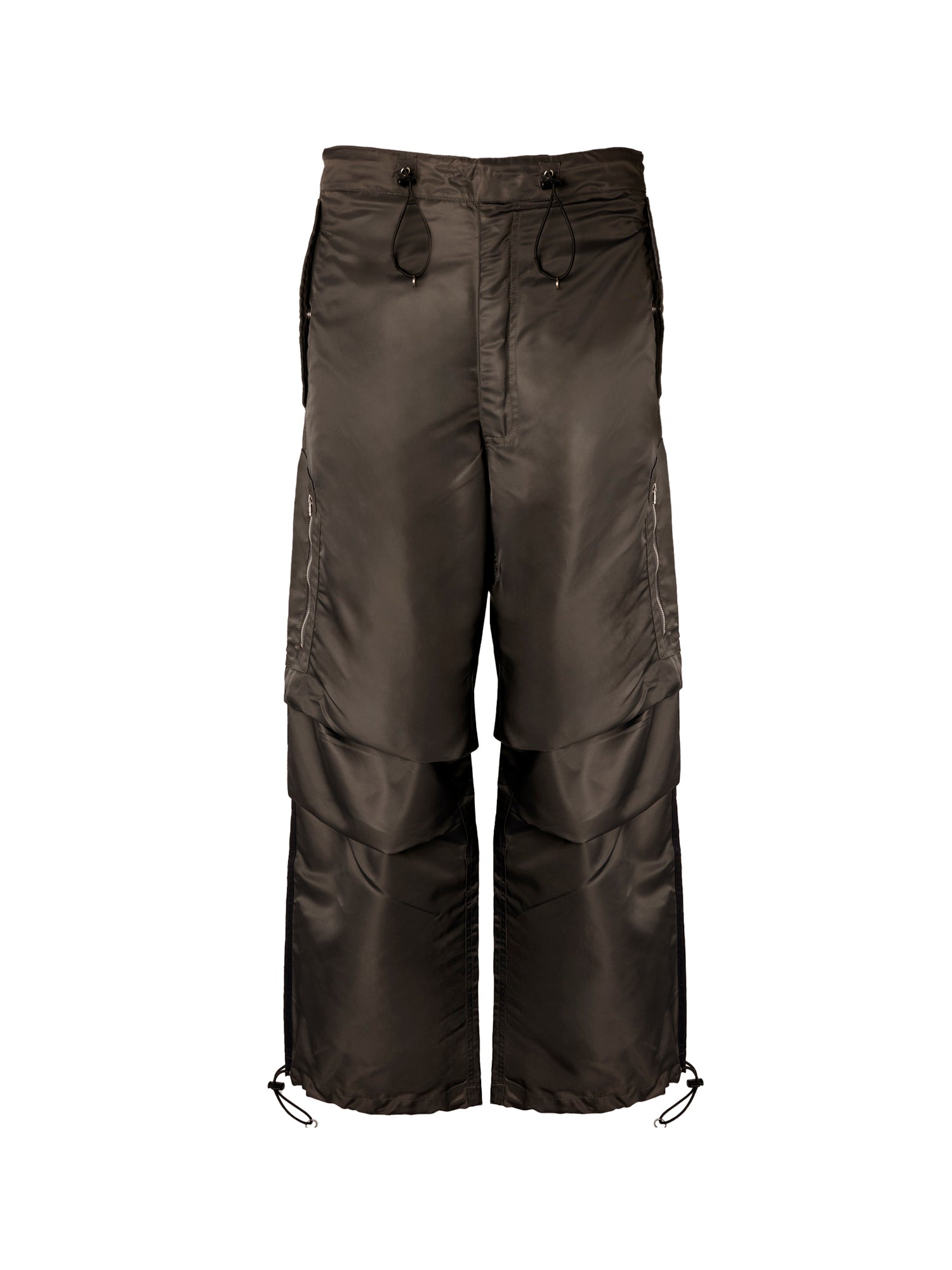 Relaxed fit nylon pants with drawcord waist and hem, officer stripe, zip patch pocket and center back zip in Bronze.