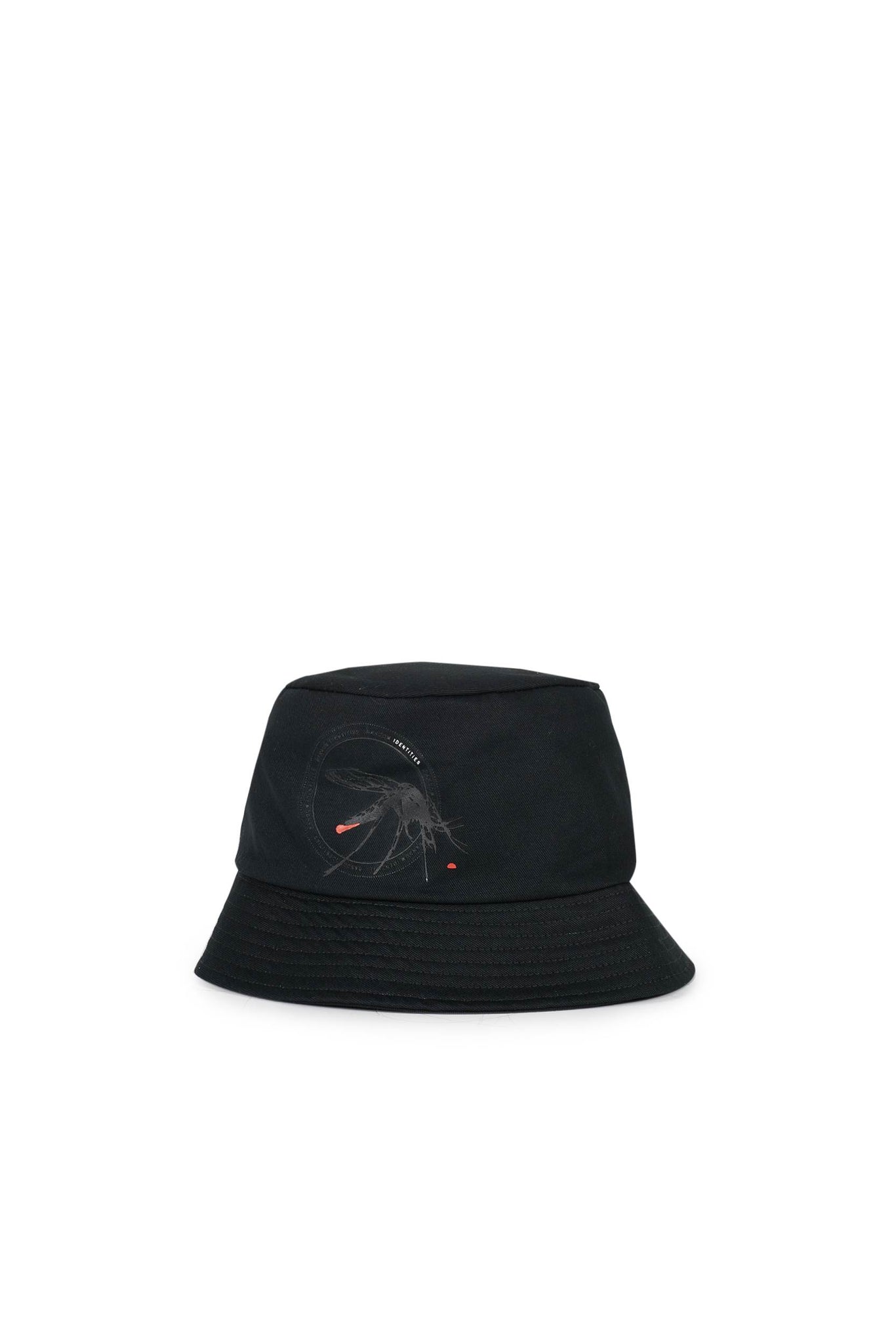 Black cotton bucket hat with mosquito graphic print, a narrow brim and visible stitching details.