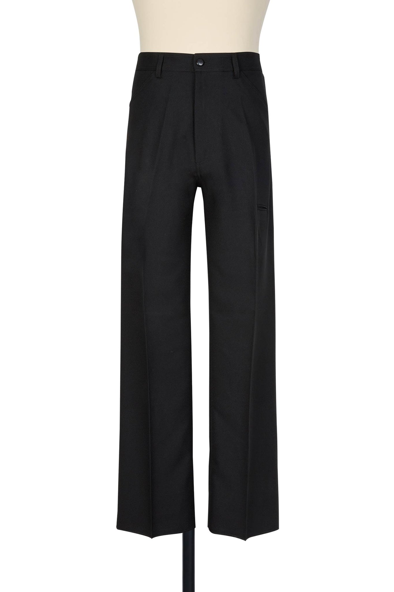 High rise straight leg five pocket trousers in red gaberdine with no side seam, tip pocket at the thigh, single jet back pockets, and a yoke insert.
