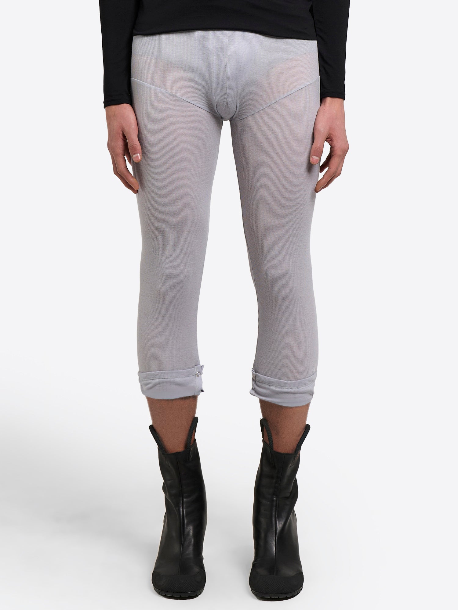 Cut as close-fitting leggings, they move easily with the body and work as both a standalone piece and a base layer under dresses, long shirts, or tailored outerwear. A cuff split at the hem creates a slight flare effect around the ankle, adding dynamic movement and allowing footwear to remain visible. Press button fastening at the cuff brings a discreet hardware detail and the option to open or close the split, subtly changing the silhouette. In Light Grey, they act as a neutral yet distinctive foundation that pairs seamlessly with monochrome or contrast looks, reinforcing a versatile, contemporary wardrobe.