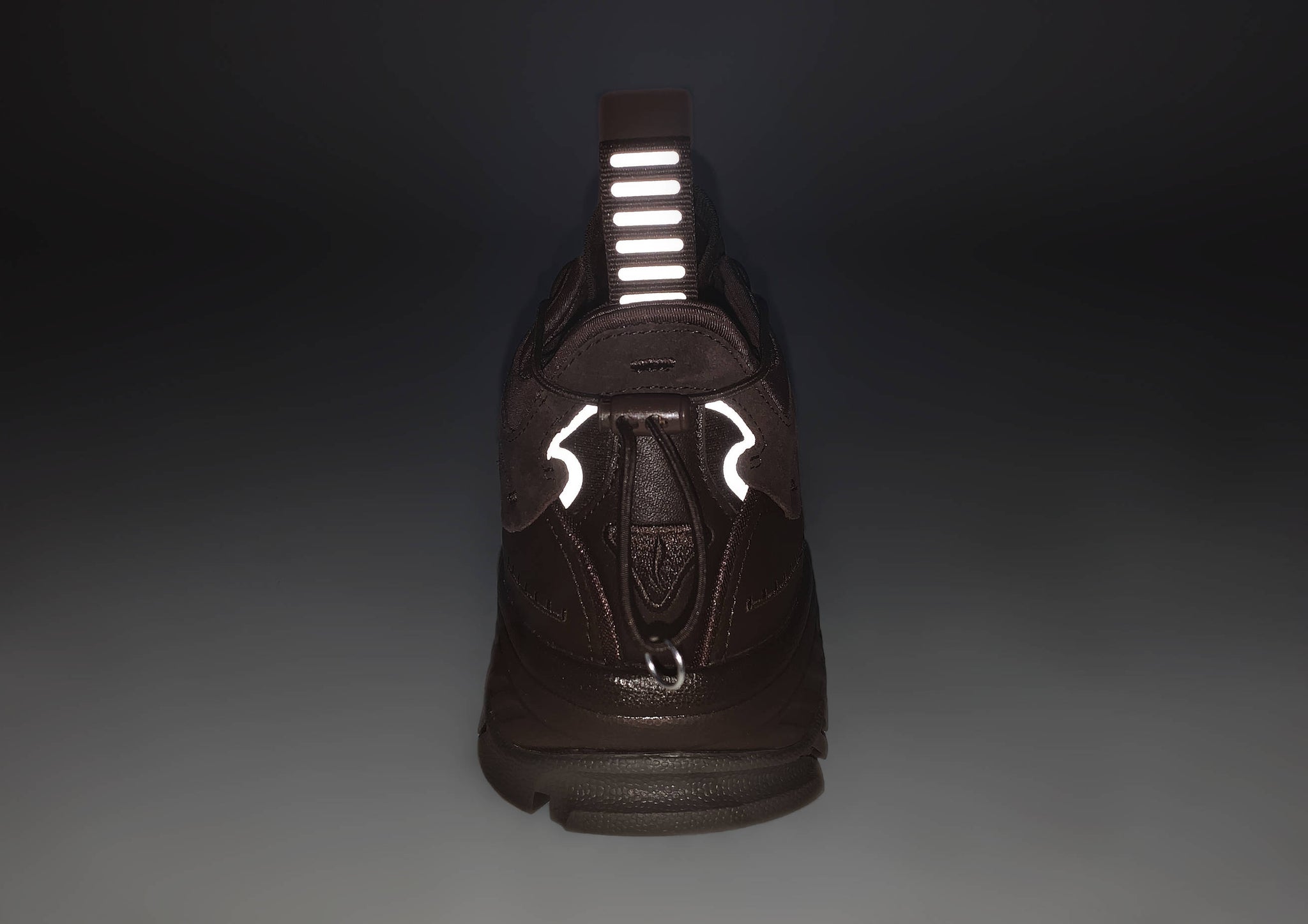 棕色皮革和尼龙运动鞋,防水网眼面料,鞋面配有三速 LED 灯,系带设计,配有调节带。