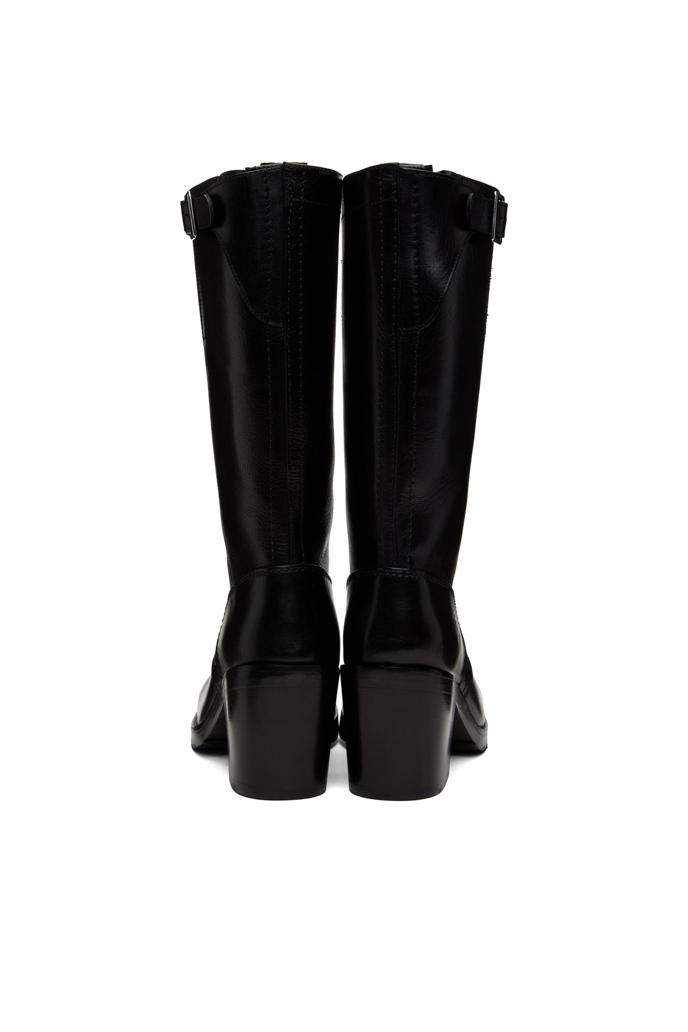 黑色全皮过膝长靴,鞋跟高9厘米,钢制加固鞋头。意大利制造。