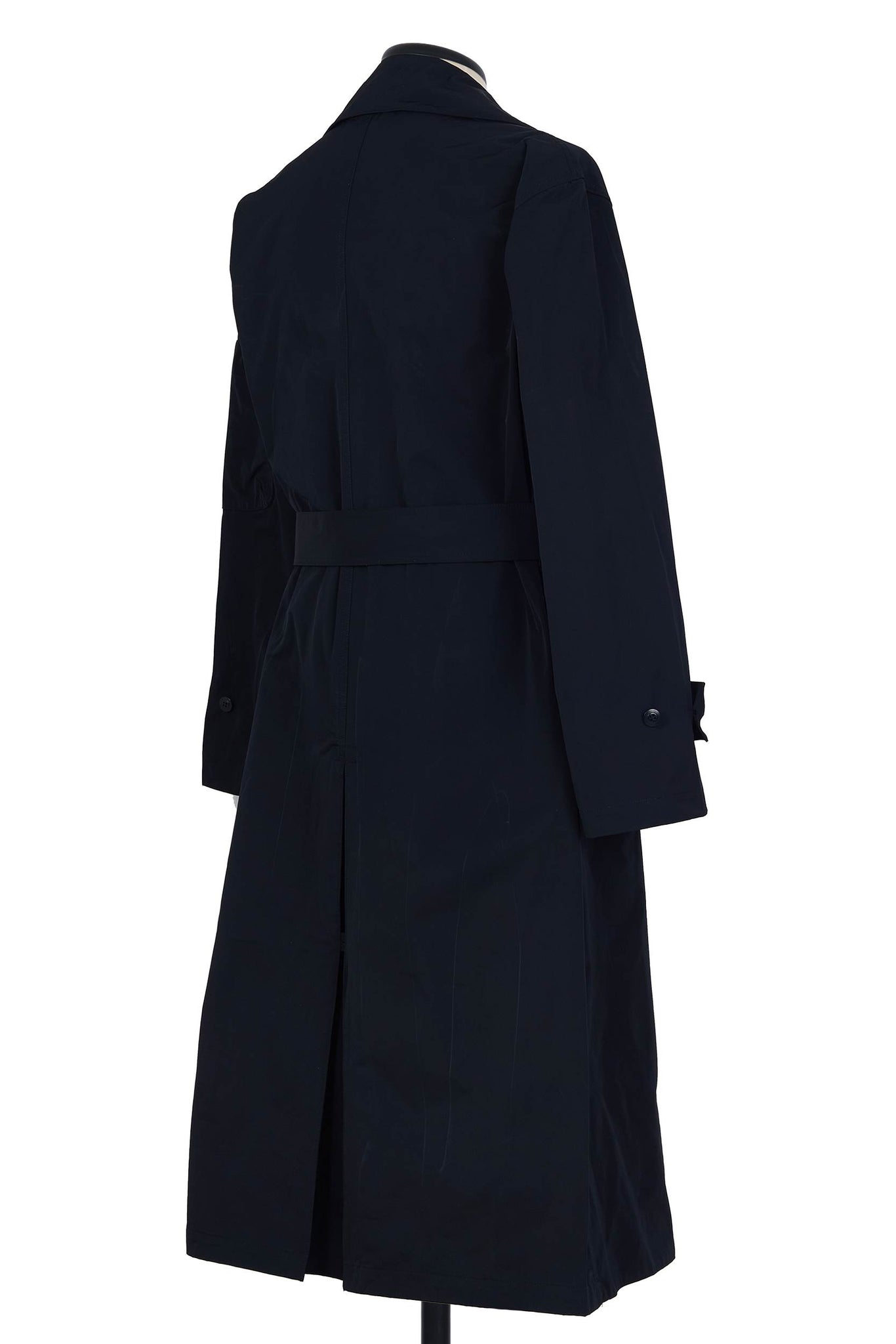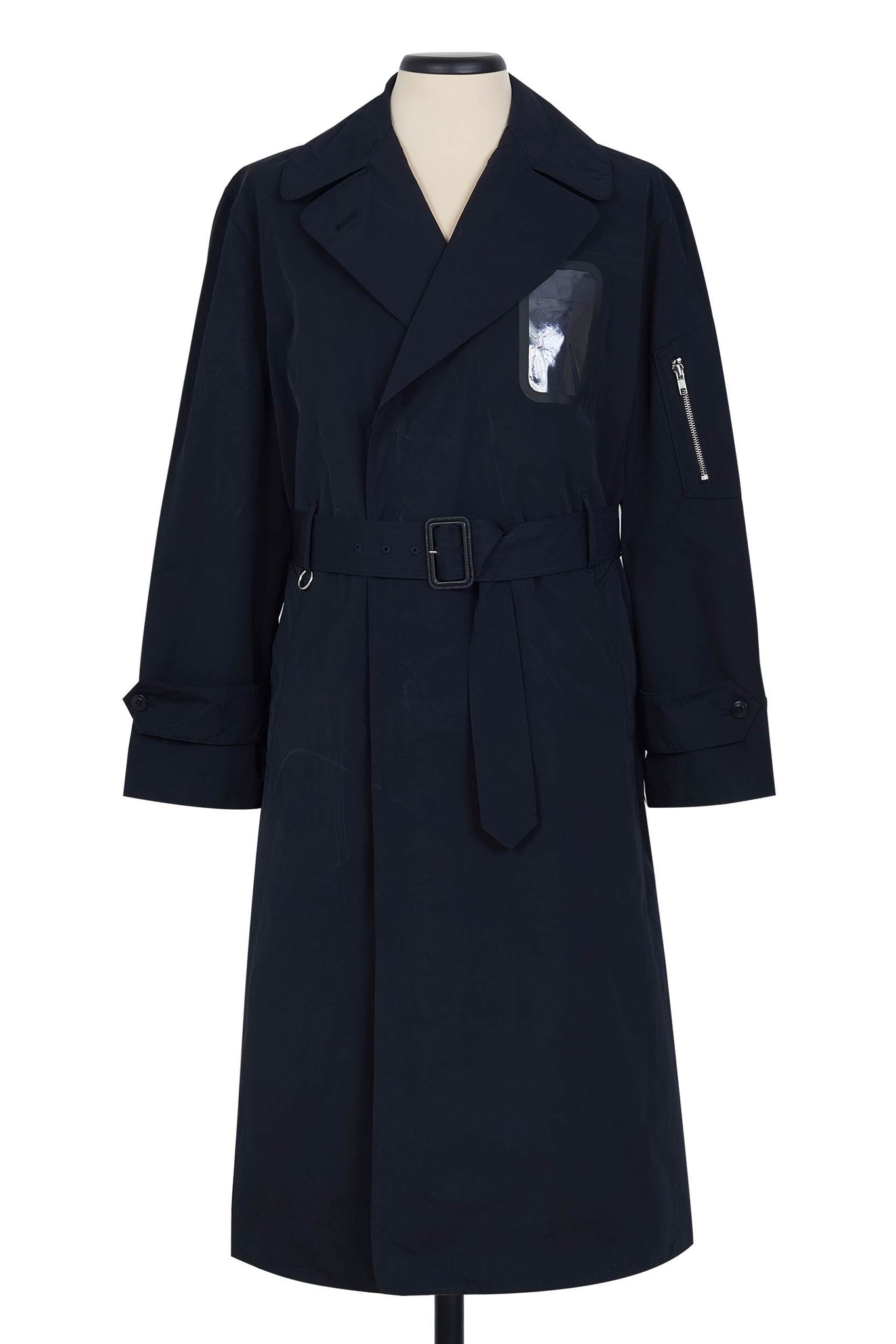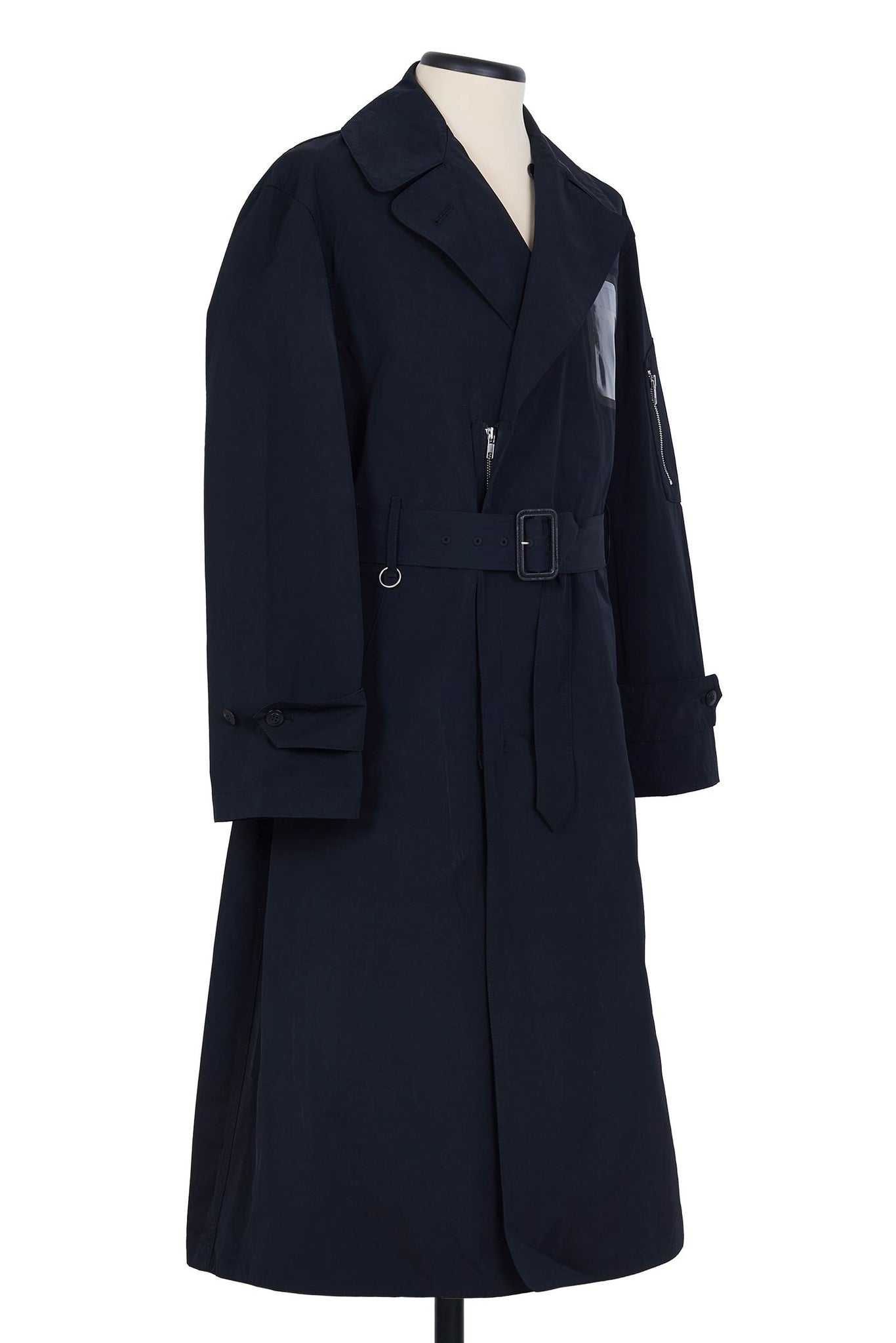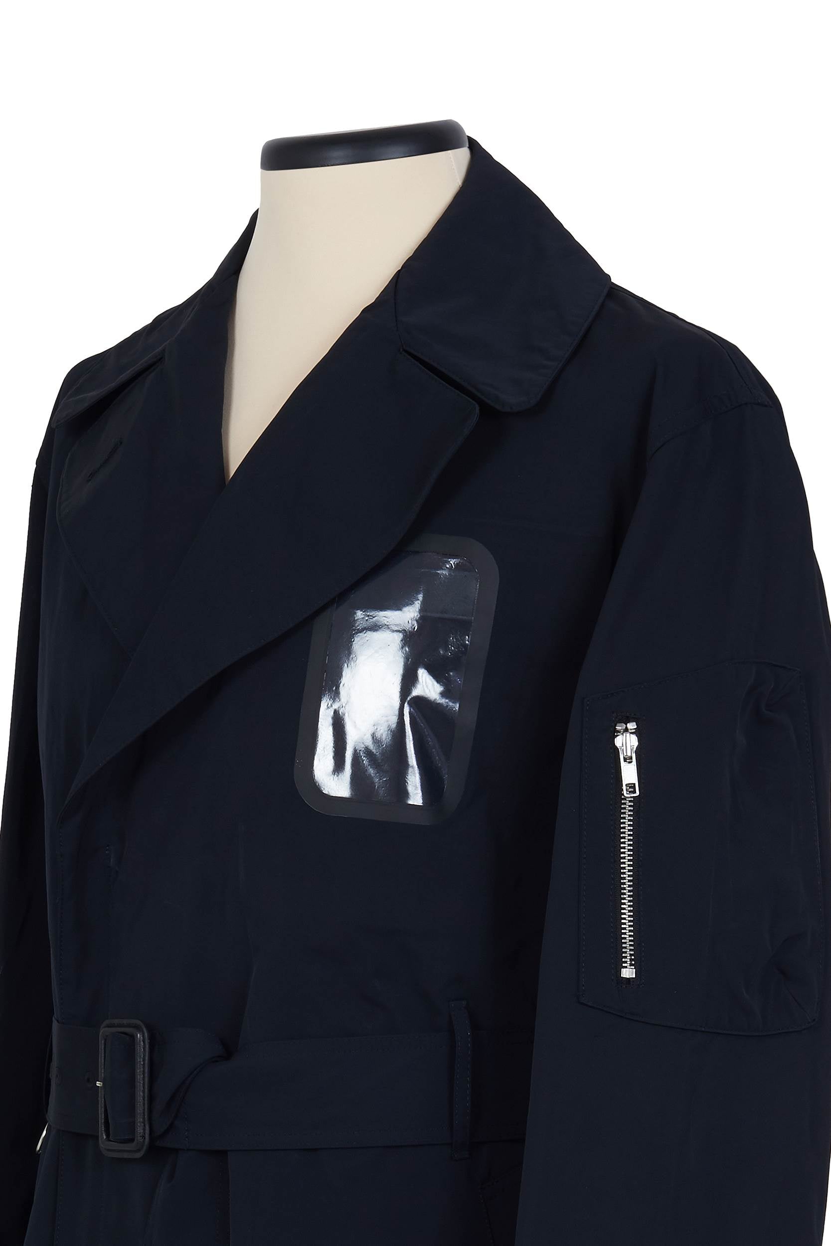 尼龙军用风衣,带透明窗口可看到内袋,配有同色腰带、隐形纽扣和高位单开衩。