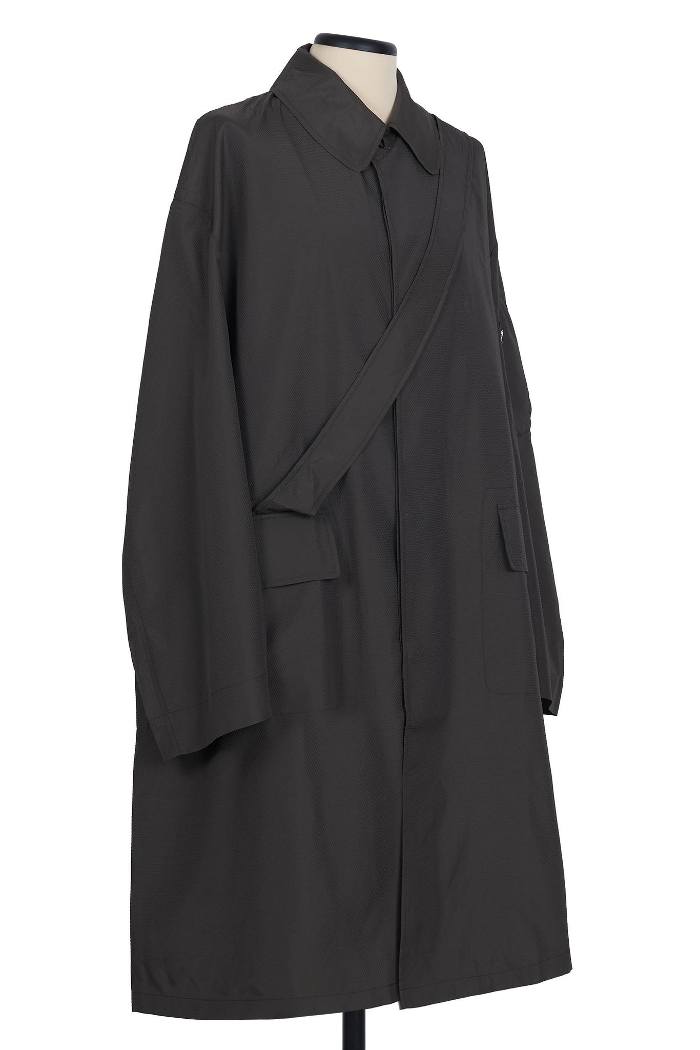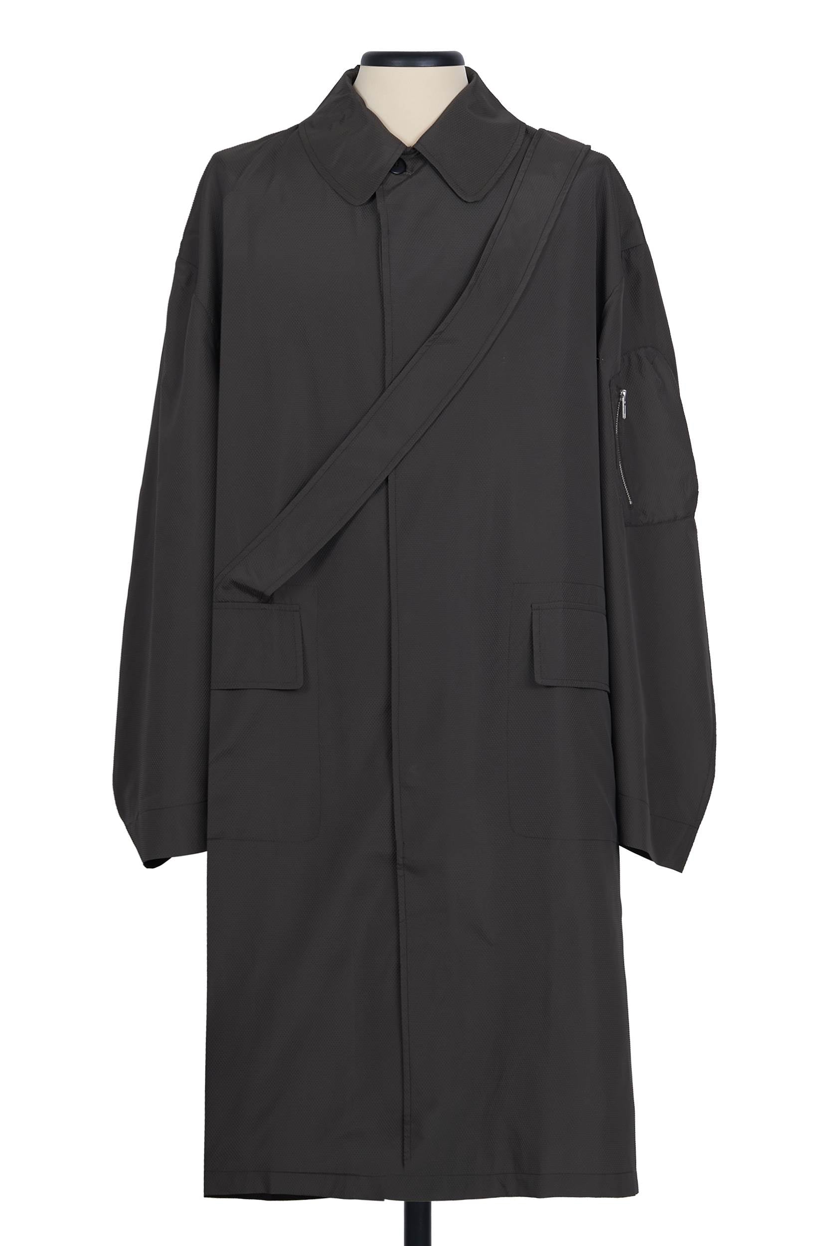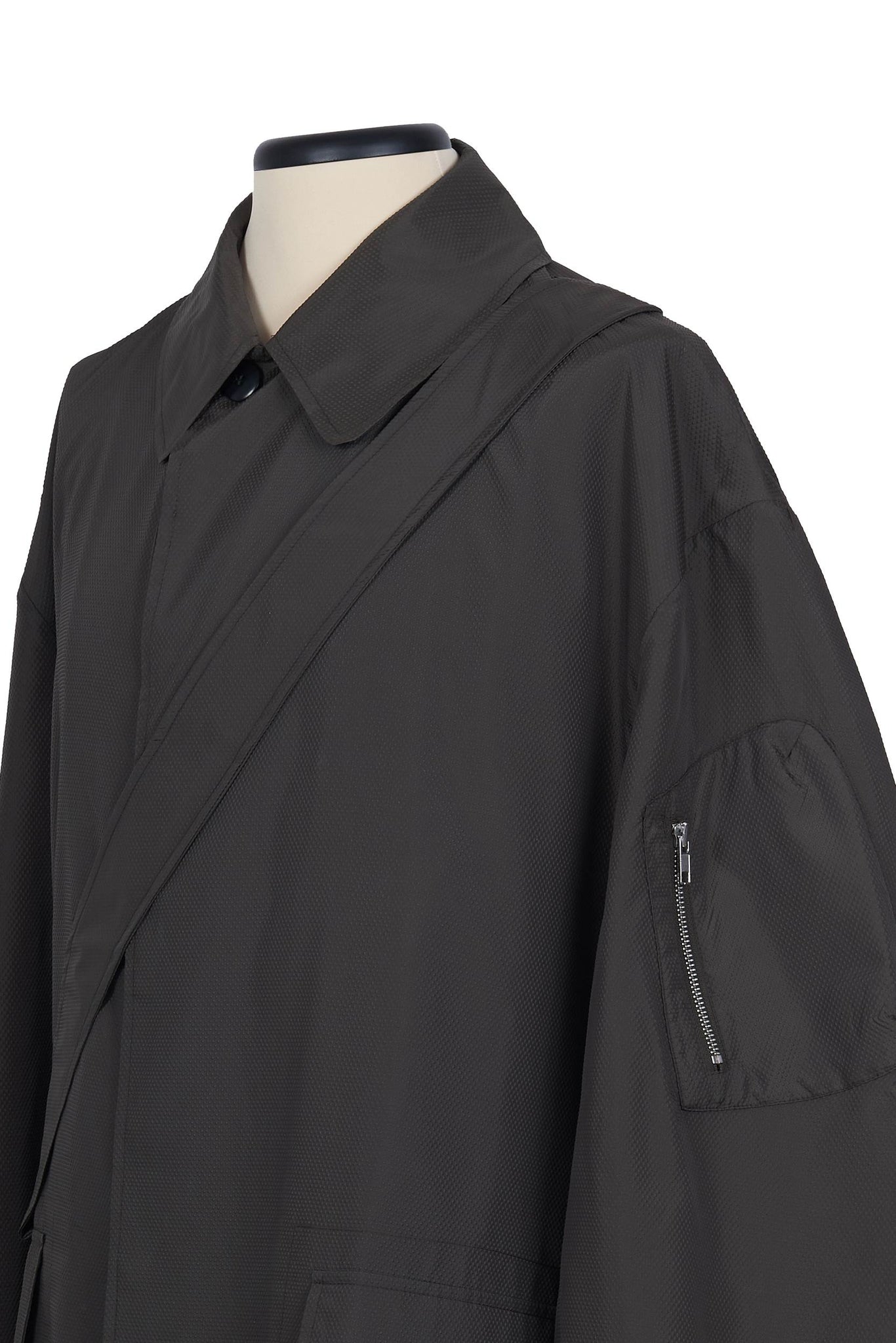 轻质尼龙雨衣,带翻盖口袋、斜挎同色面料肩带、袖子拉链口袋和单开衩。